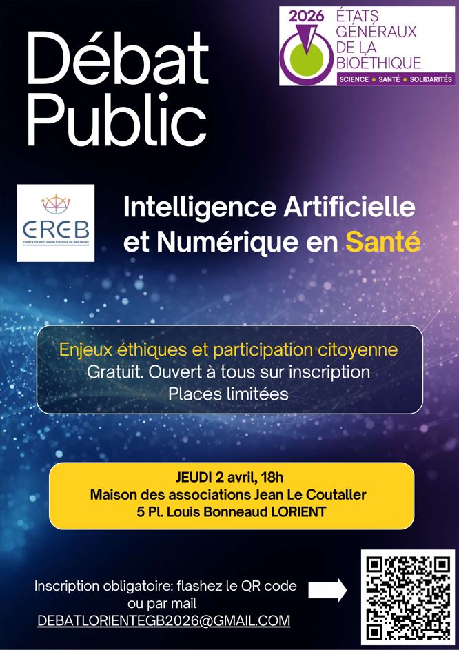 Dans le cadre des États généraux de la bioéthique 2026, le territoire de santé de Lorient organise un débat public autour du thème « Intelligence artificielle, numérique et santé », à l’initiative de l’Espace de Réflexion Éthique de Bretagne (EREB).