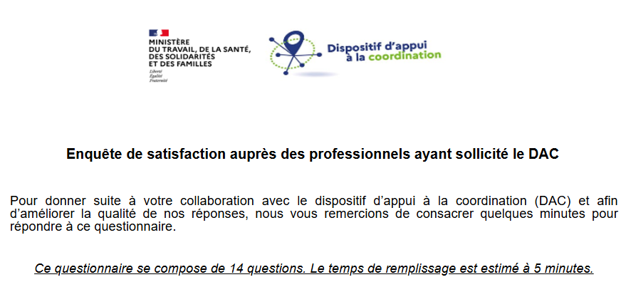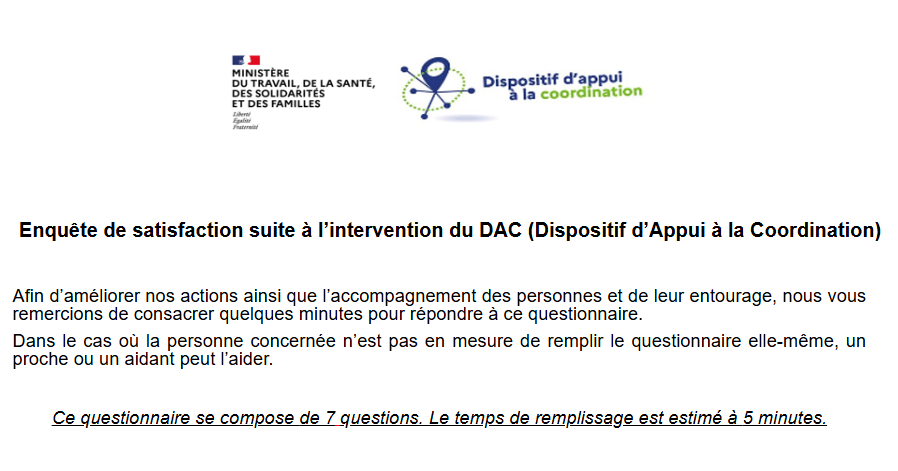 Dans le cadre d’une démarche nationale d’évaluation du service rendu des DAC, pilotée par la DGOS (Direction Générale de l’Offre de Soins), nous souhaitons recueillir votre perception sur l’appui du DAC dans la prise en charge et la coordination des situations complexes.